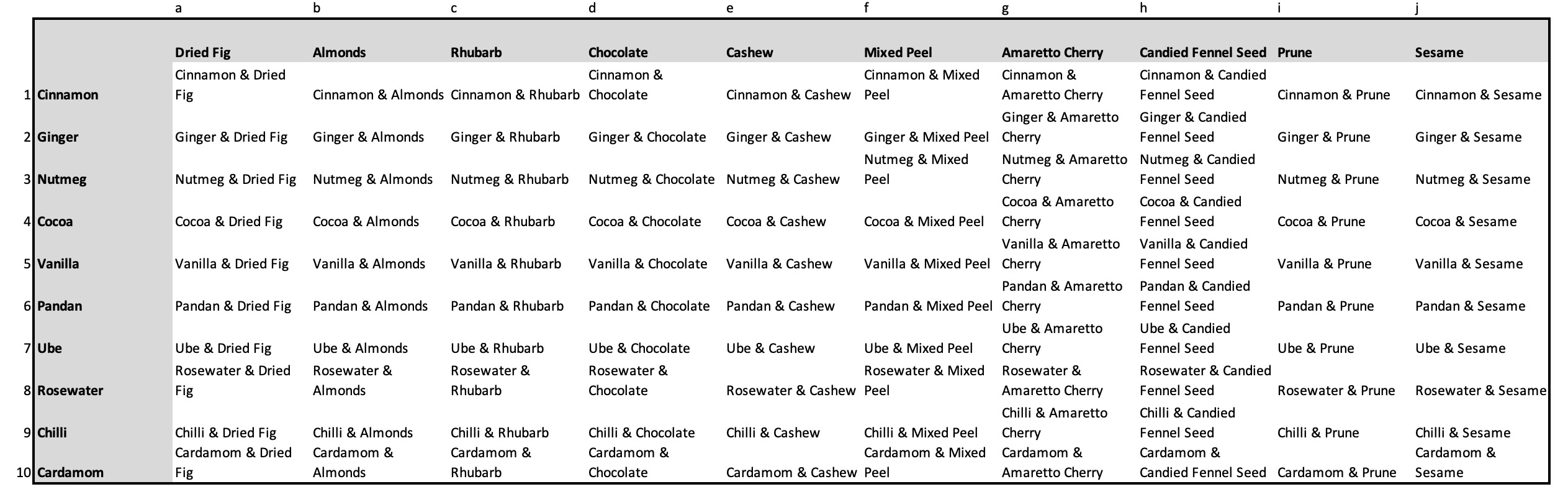 repeat with the remaining flavours and mix-ins until you have assembled all 100 unique flavour combinations