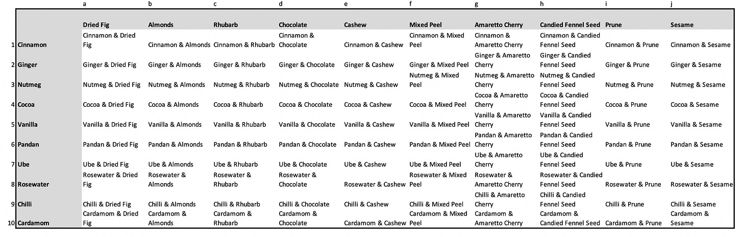 so in true penny’s kitchen form, i thought i’d celebrate 100 unique subscribers with a matrix - a 10 x 10 matrix with 10 flavours and 10 mix-ins