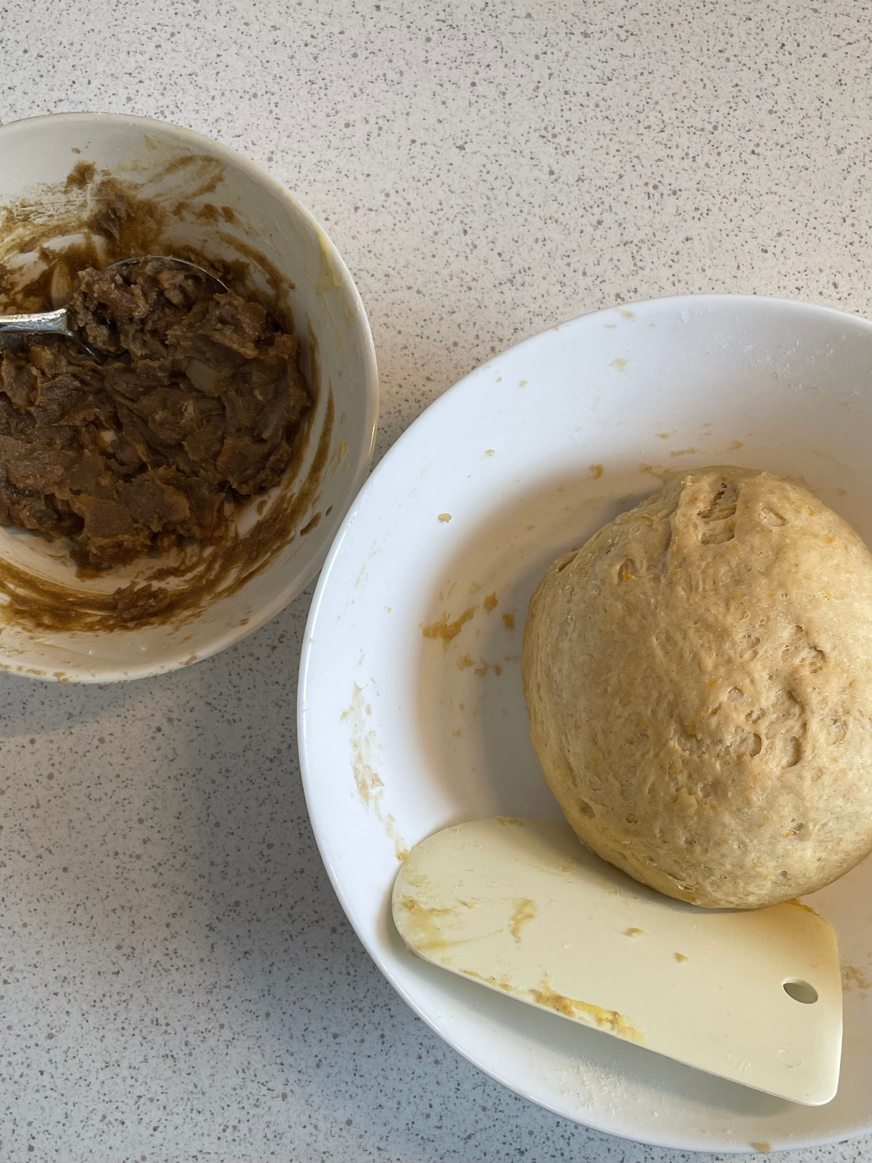pour in the milk and yeast mixture, add the softened butter (28g), and mix thoroughly to combine until it forms a dough