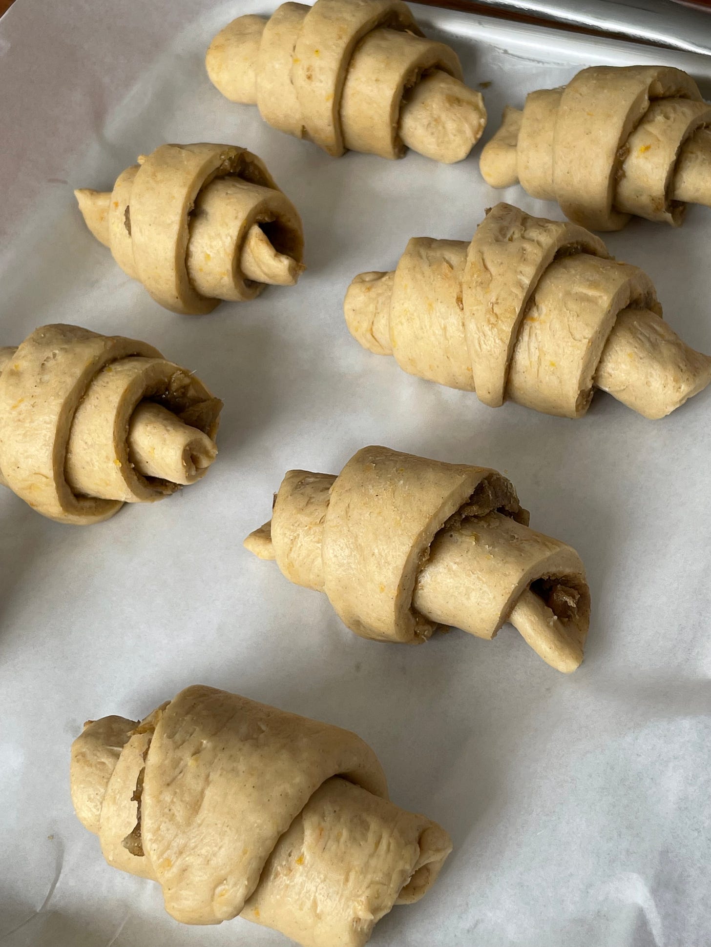 beginning with the long edge, roll up into a croissant shape and tuck the small end at the bottom