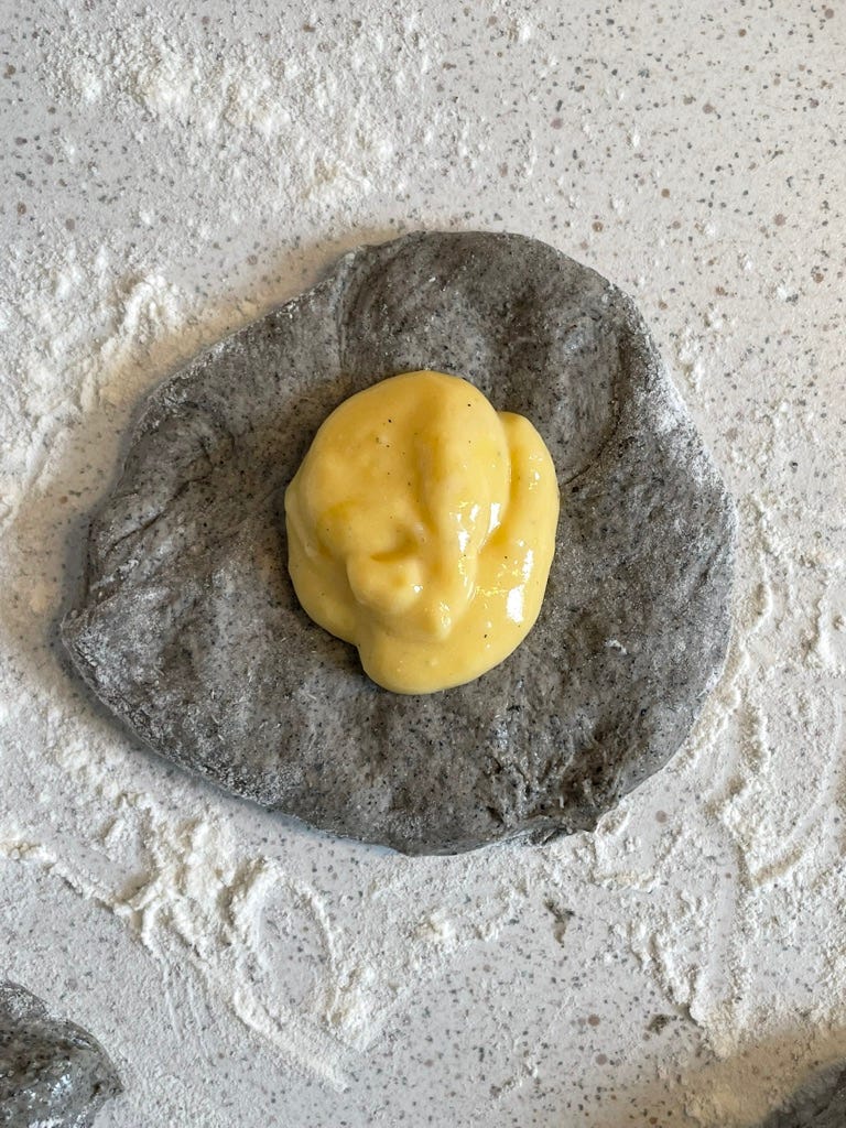 place a generous spoon of cheese cloud filling in the centre of the disc