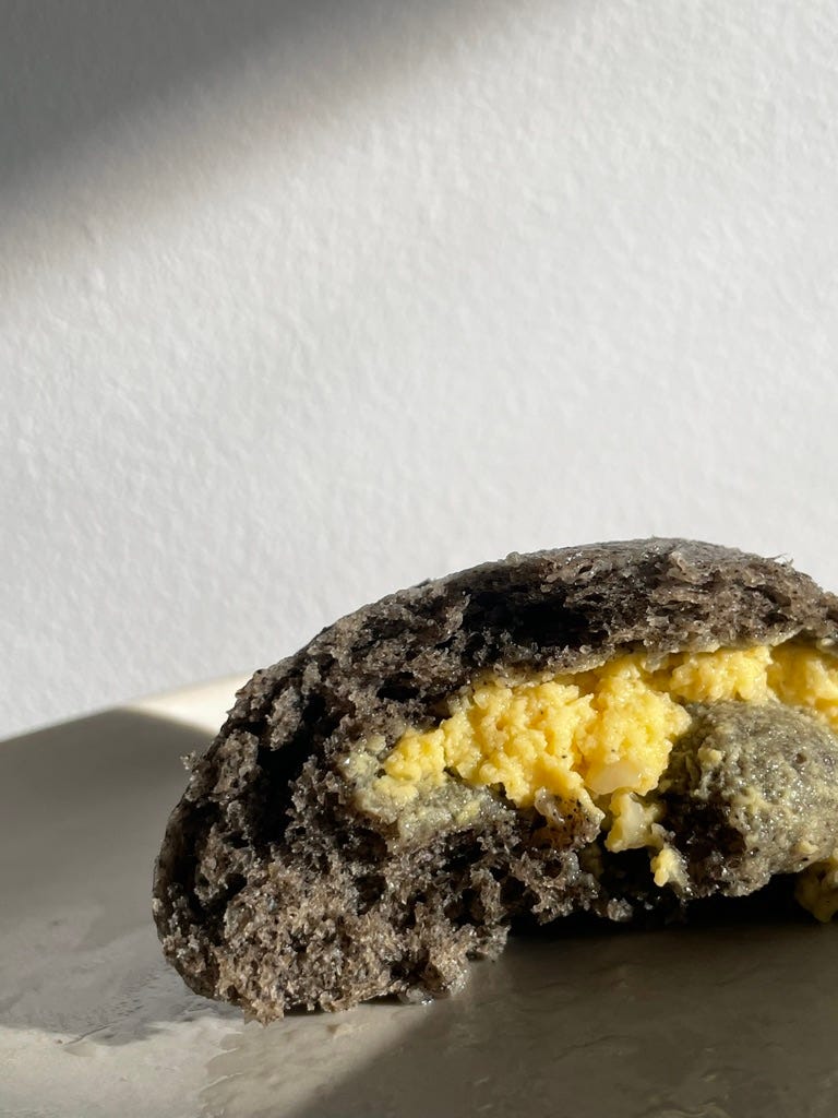 but instead of floating on tea, this cheese cloud is tucked inside a warm, fluffy black sesame bun