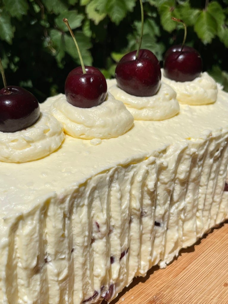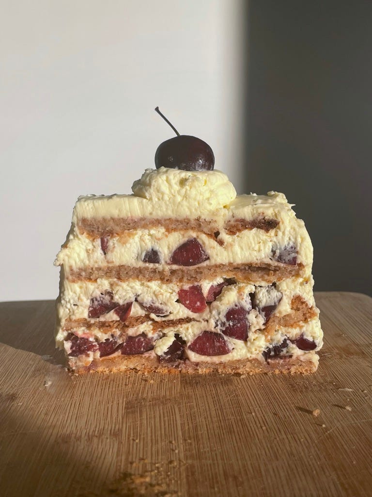 layers of roasted almond meringue, mascarpone cream, and fresh cherries