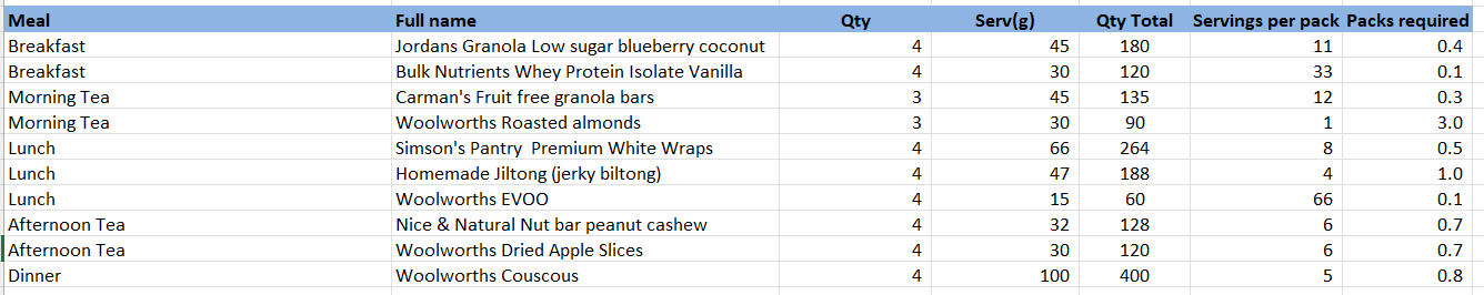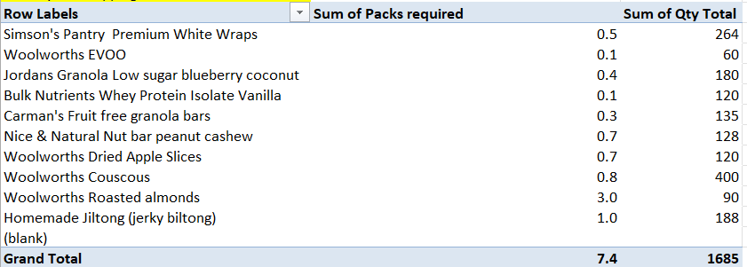 this can then be multiplied out by each meal to calculate the total quantity of each item required (or the total packets required for items like wraps that come in a pack of 8)