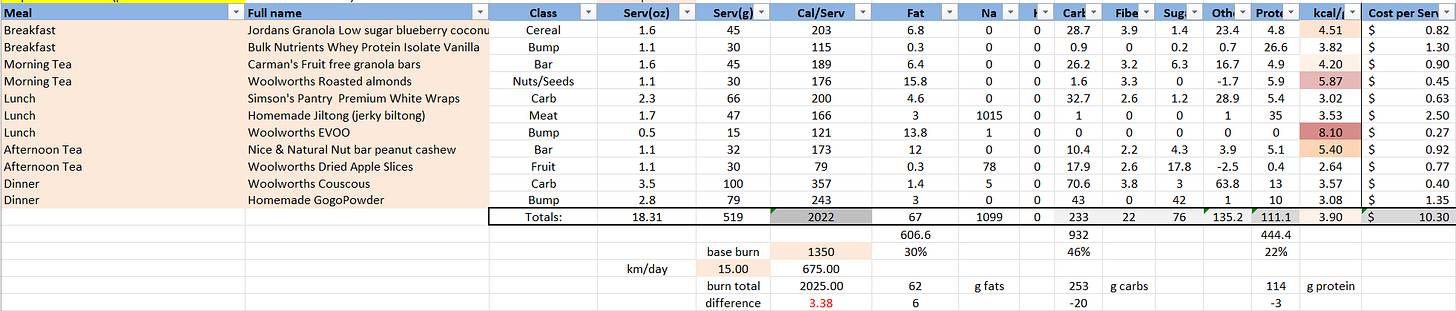 i also care about the total weight of my meal plan, which we noted is a delicate balance between lightweight fats and heavier carbs. i like to target 4-5 cal/g for a meal plan to keep it in ‘ultralight’ territory so this plan is a little easy. i would also go back in and swap some items for denser items - maybe swapping the dried apple (only 2.64 cal/g) for macadamia nuts (7 cal/g) and accept the slightly lower carbohydrate intake. i might also swap the apple for a sports powder like gatorade powder, skratch powder or similar (about 3.5 cal/g), depending on how intense the hike looks to be (remember from before: more intense == more carbs burnt)