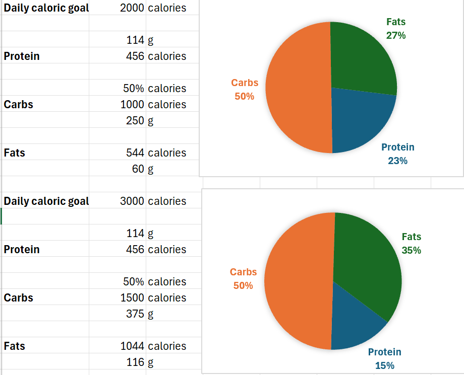 we can see the protein target is steady, and the carbohydrate and fat targets flex to hit the increased needs of the bigger hike