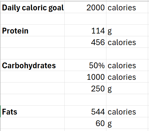 note i keep my protein target fixed, irrespective of the daily caloric need. that is, if i was doing a longer, harder day with a higher caloric requirement i would still target that 114g of protein, but it would take up a proportionally smaller percentage of my intake.