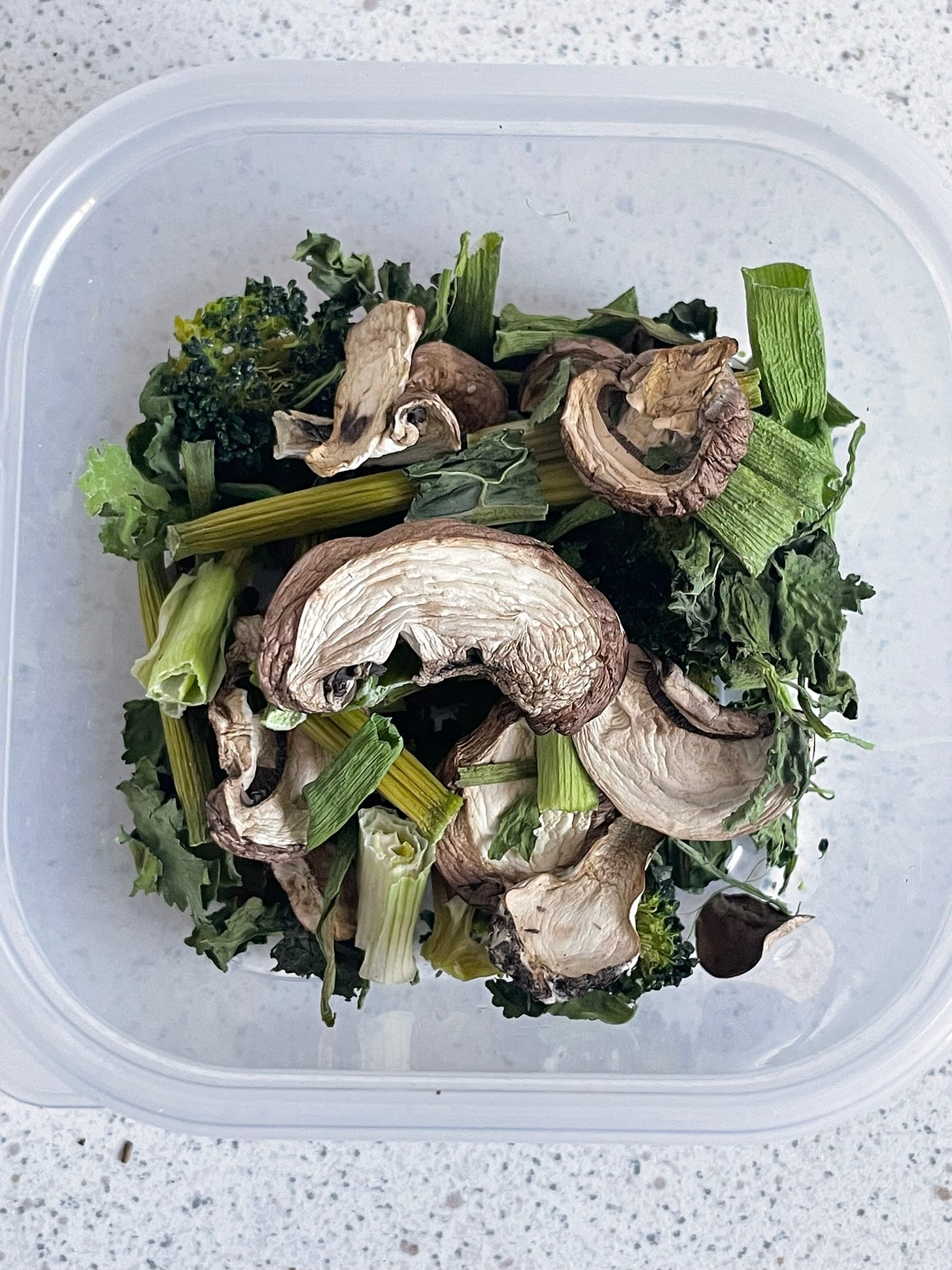 note i dehydrate all my veggies in advance, and mix and match them to make meals as required. the veggies listed below are easily swapped for the same weight of carrots, corn, capsicum, or any other vegetable you’ve managed to dehydrate!
