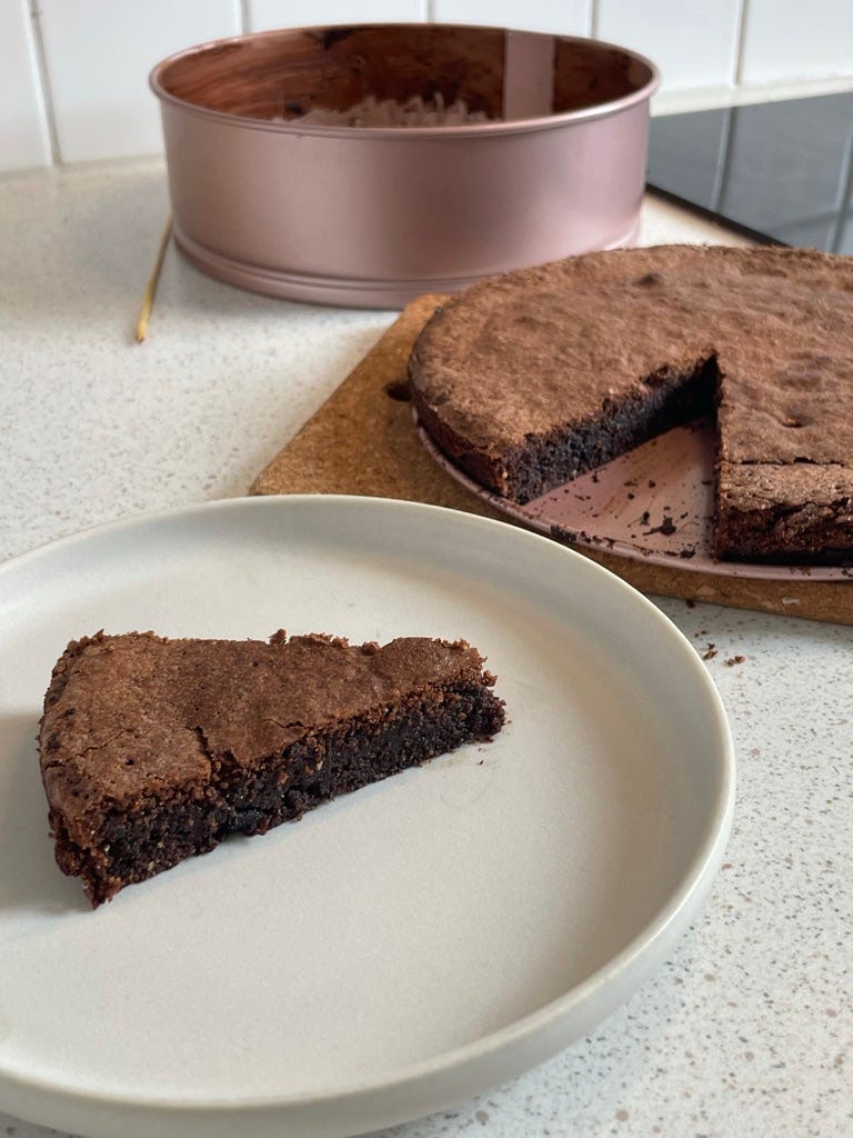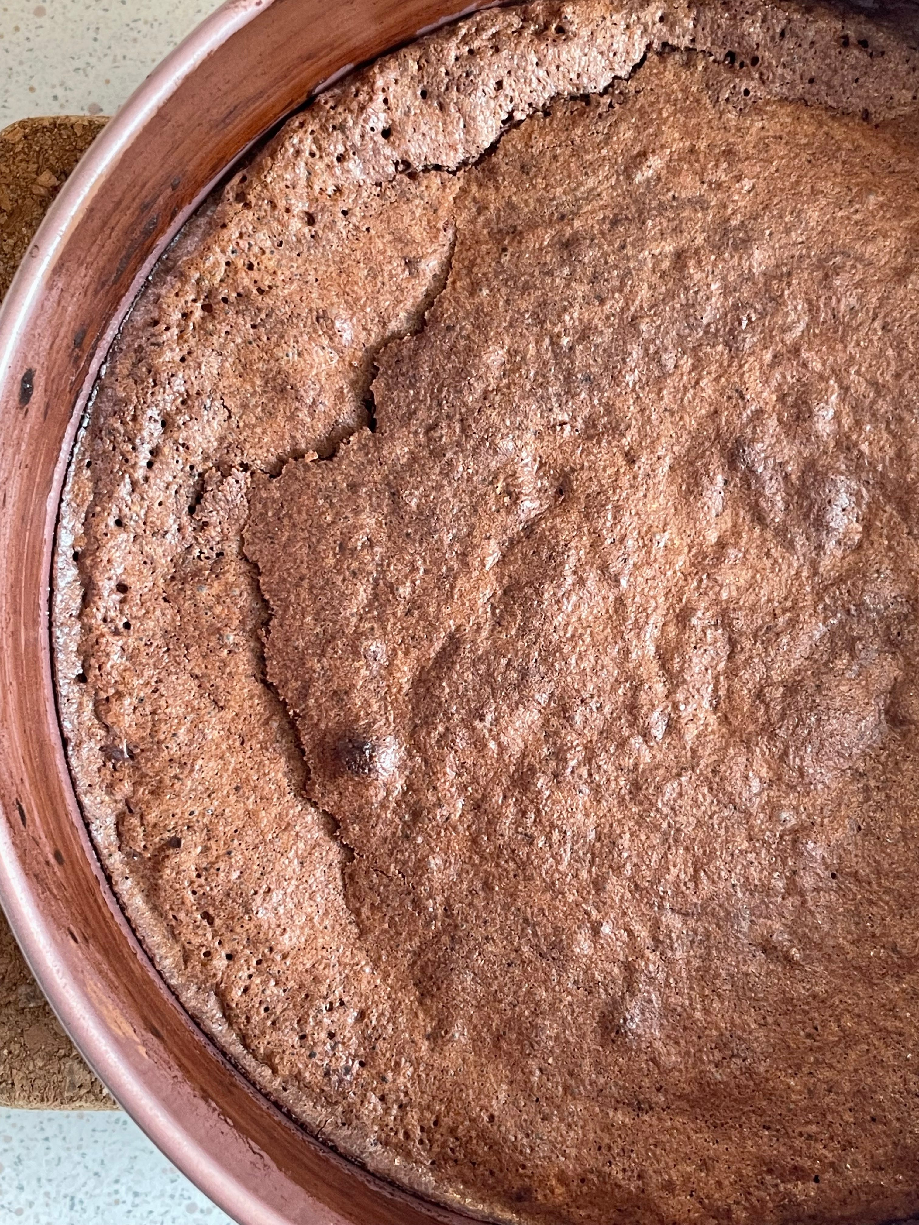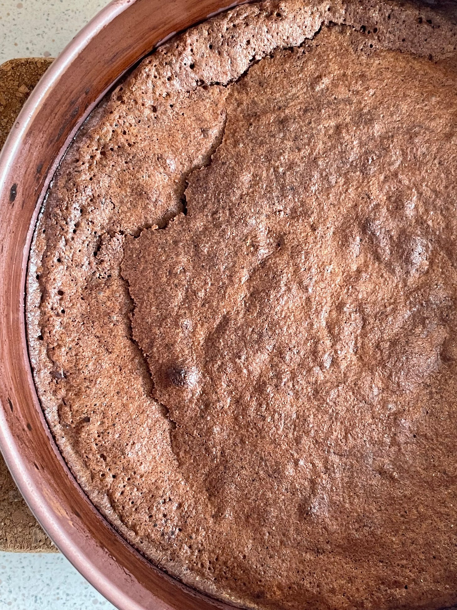 liberally butter an 8-inch round cake tin and dust generously with cocoa powder