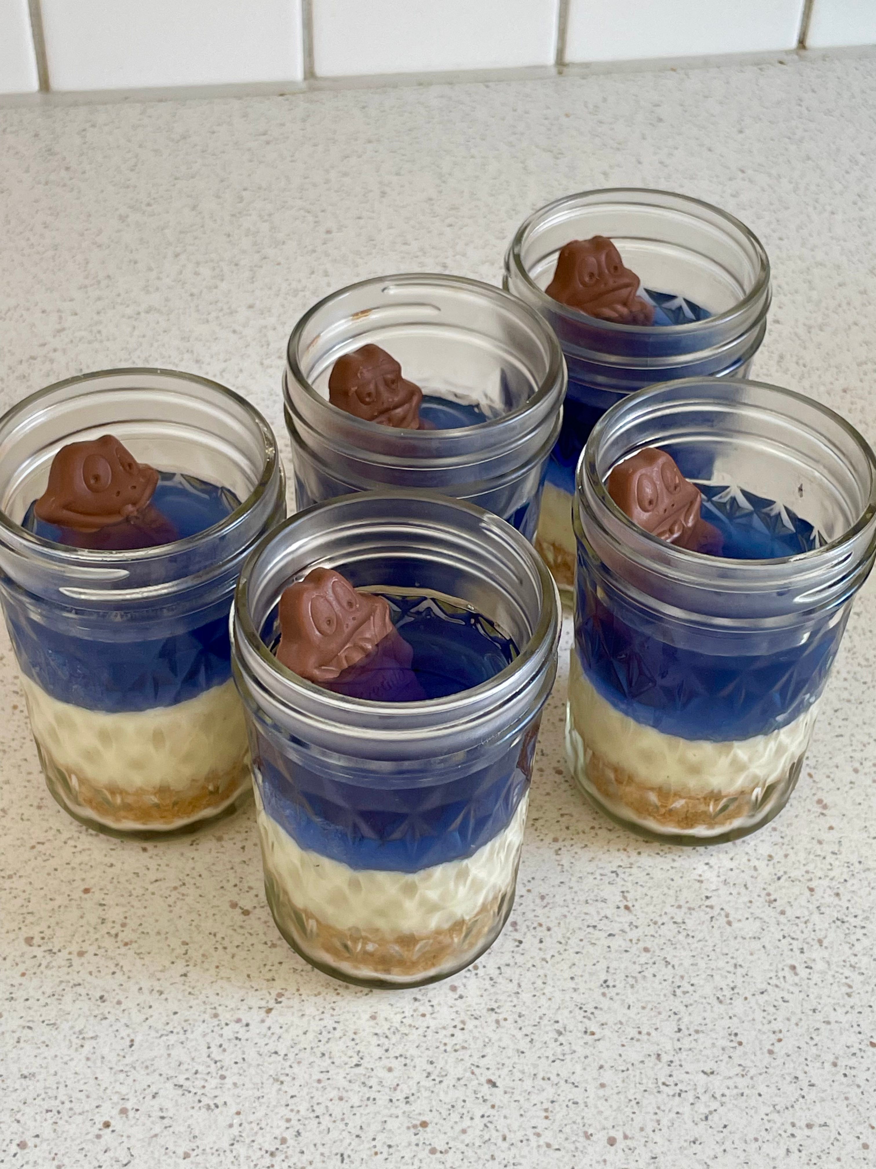 gently pour over the cooled jelly to submerge the frogs in the ocean water up to their necks