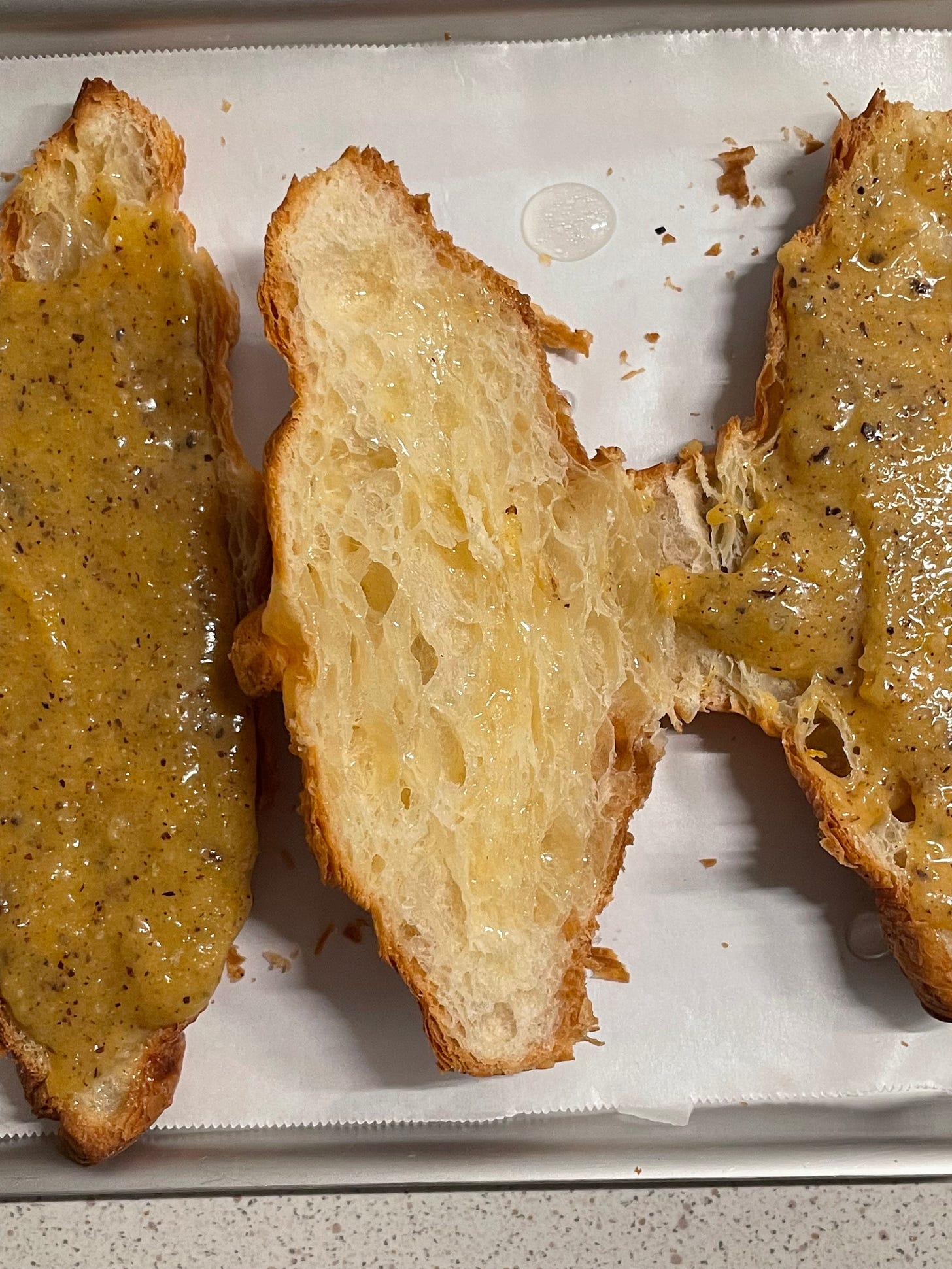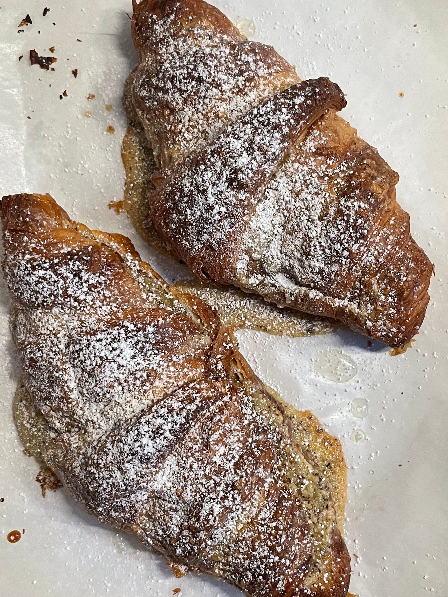 place the tops of the croissants back on the filled bases, and add a thinner layer of the remaining frangipane to the top of the croissants