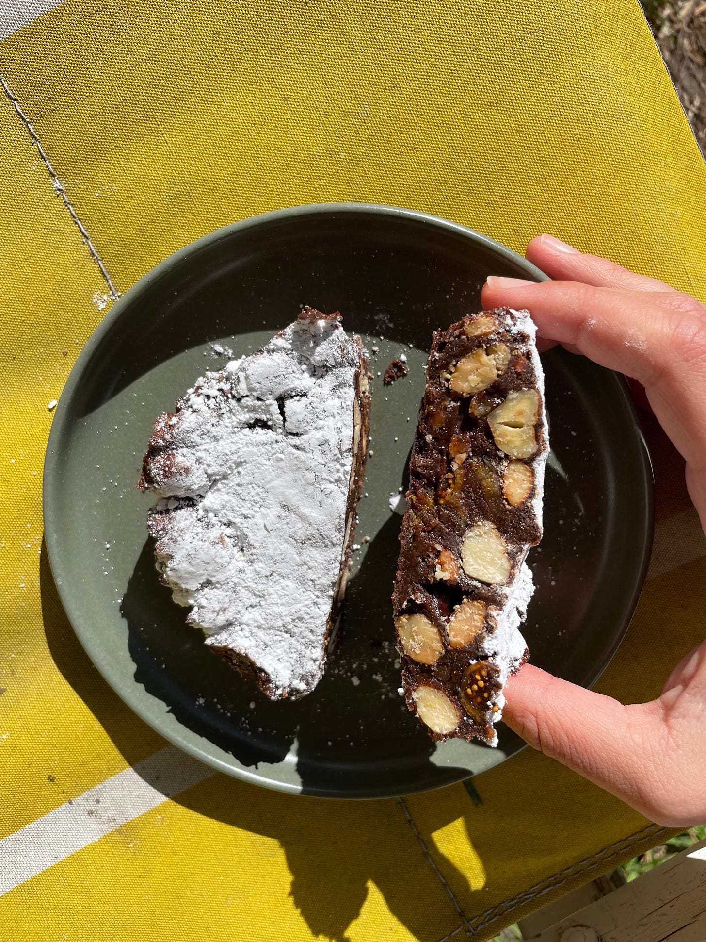this is my take on panforte nero (dark, with cocoa), with hazelnuts, dried figs and a touch of coffee to amp up the dark, toasty flavours
