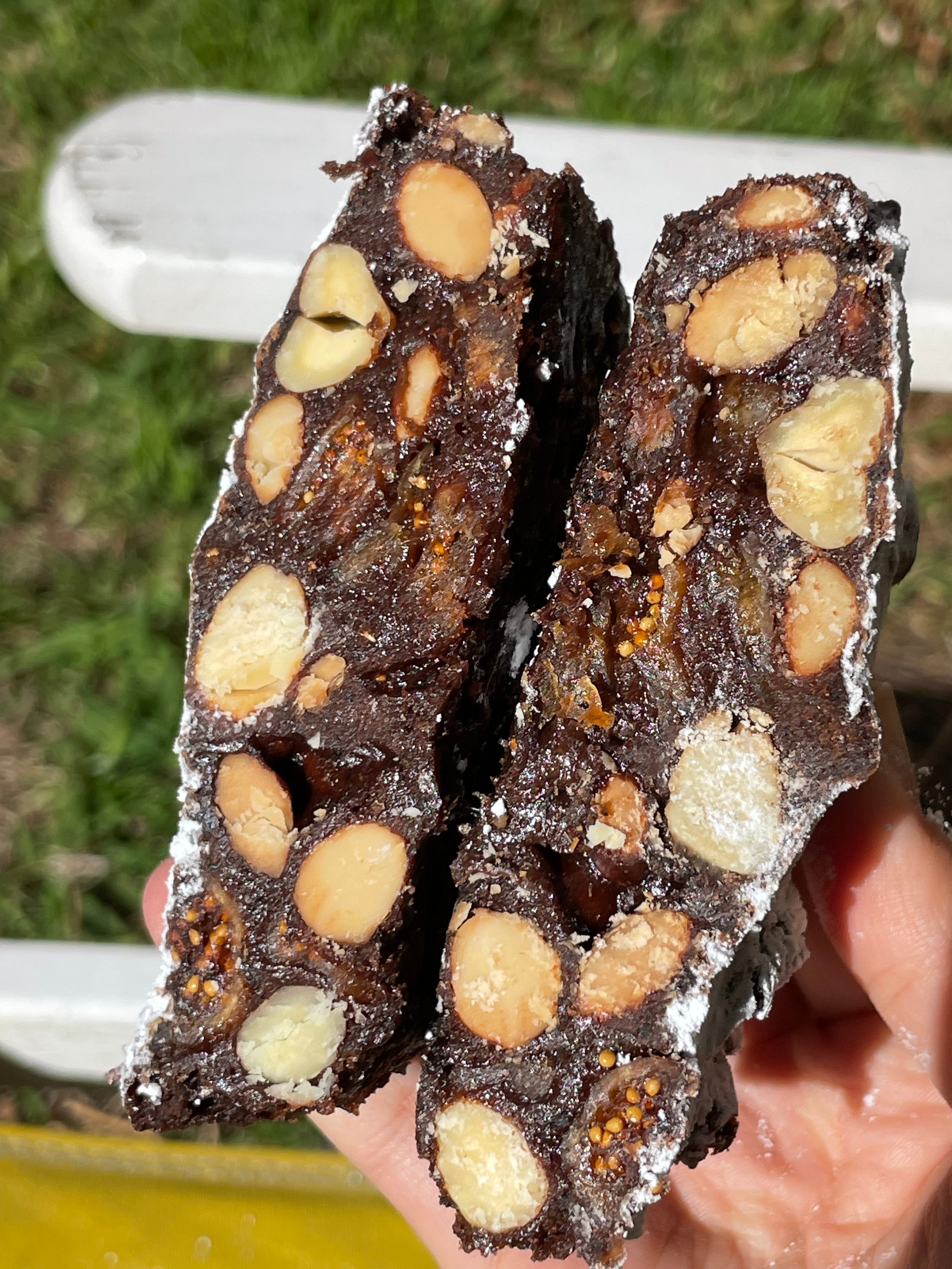 panforte is a dense, sticky, heavily spiced disc of nuts and dried fruit glued together with honey that dates to 13th century tuscany