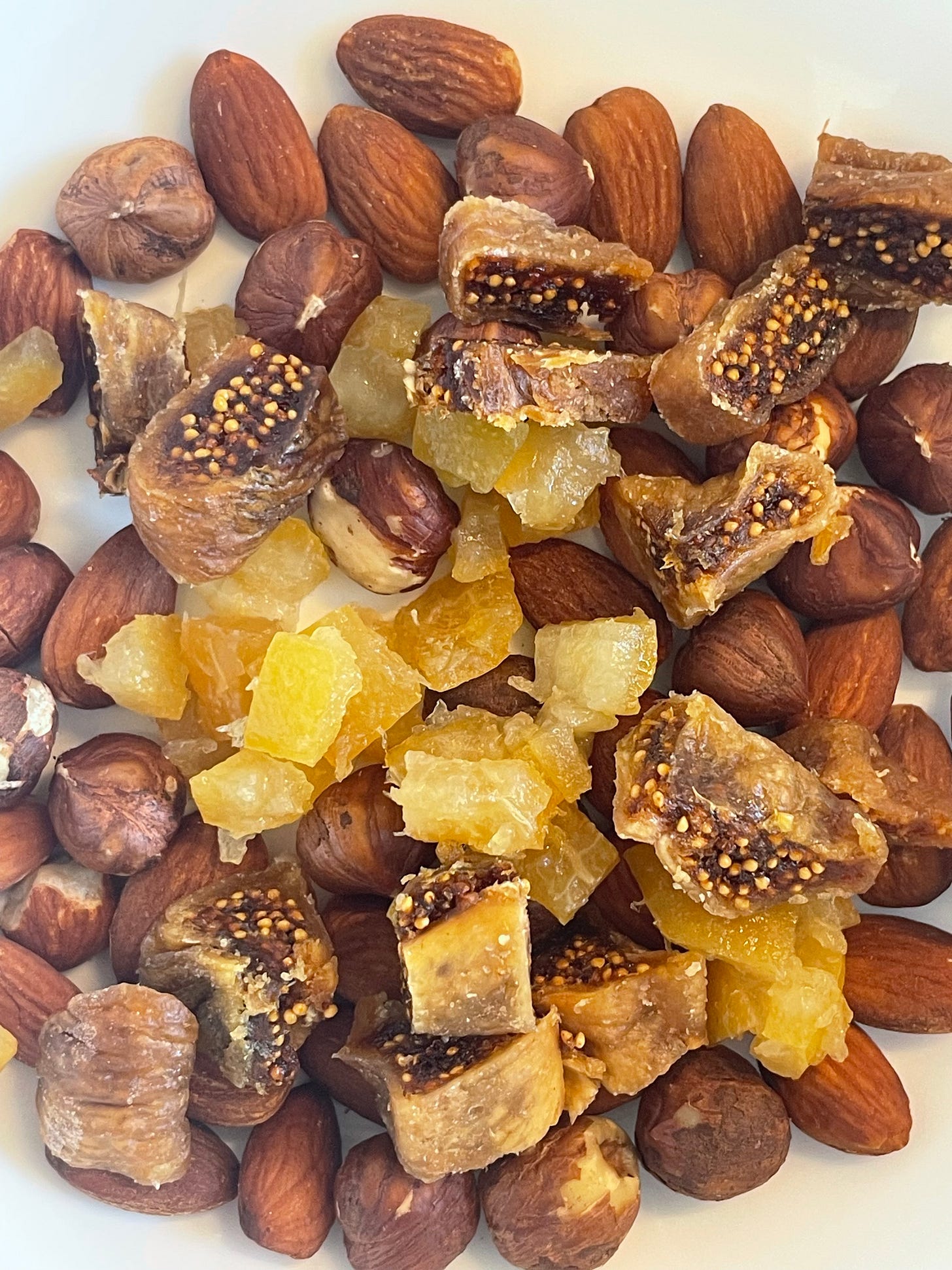 add the almonds (40g), hazelnuts (30g), lemon peel (30g), dried figs (30g), flour, (30g) cocoa powder (1 tbsp), cinnamon (1 tsp), ginger (0.5 tsp), cloves (1 tsp), nutmeg (1 tsp), salt (pinch) and pepper (few cracks) to a medium bowl and mix through to distribute the spices evenly