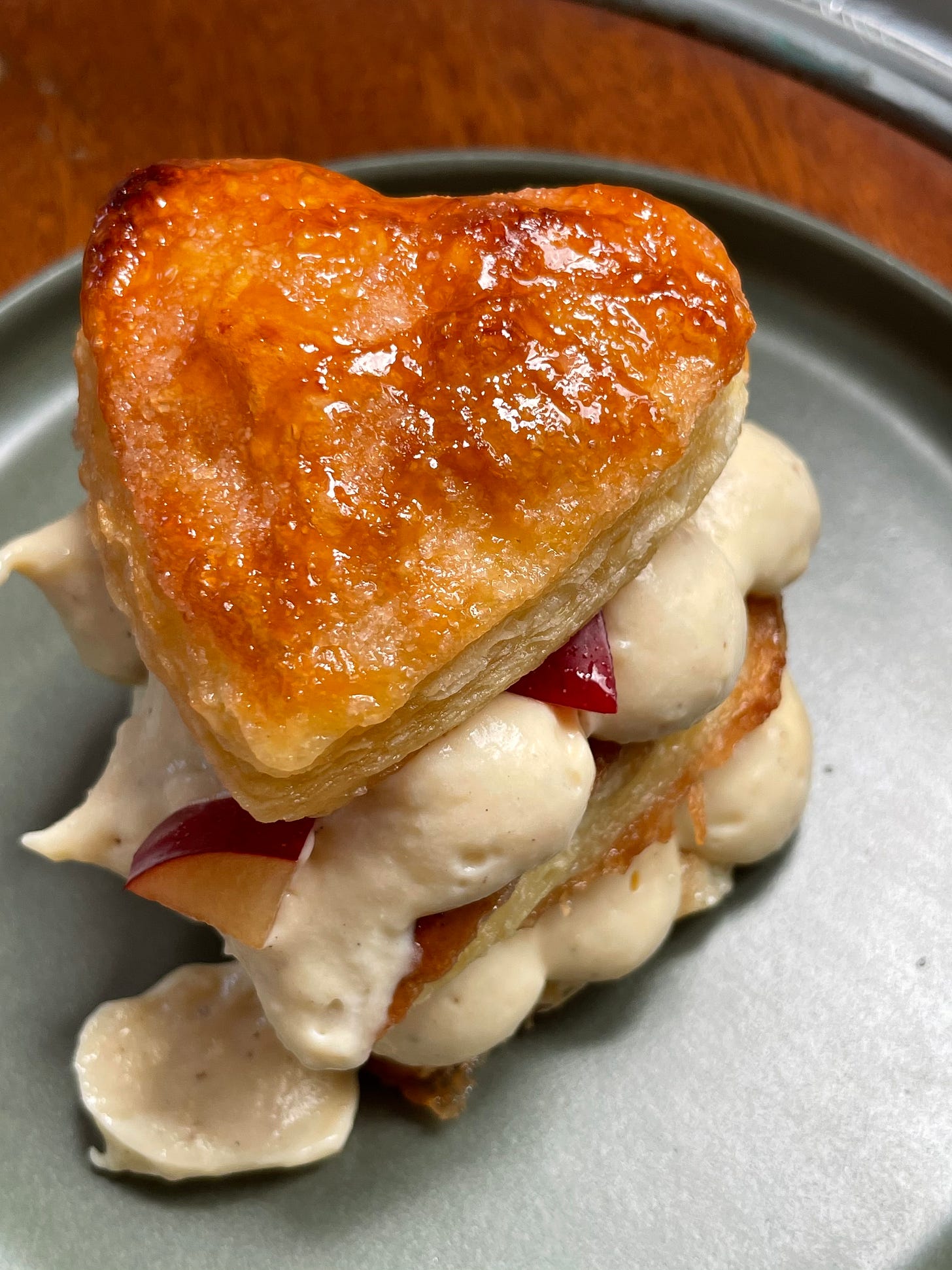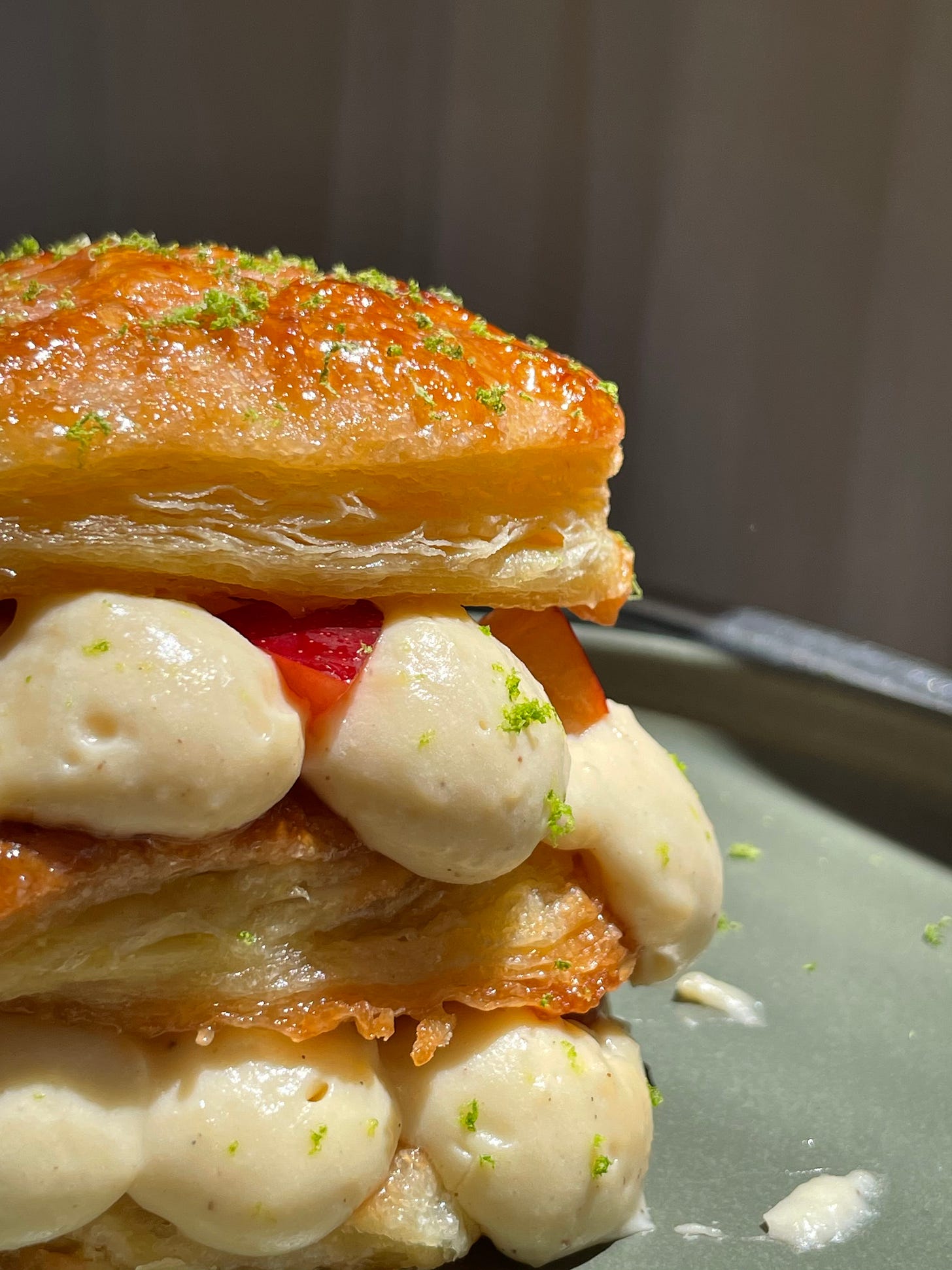 layers of kaffir lime creme patisserie, fresh plum & puff pastry
