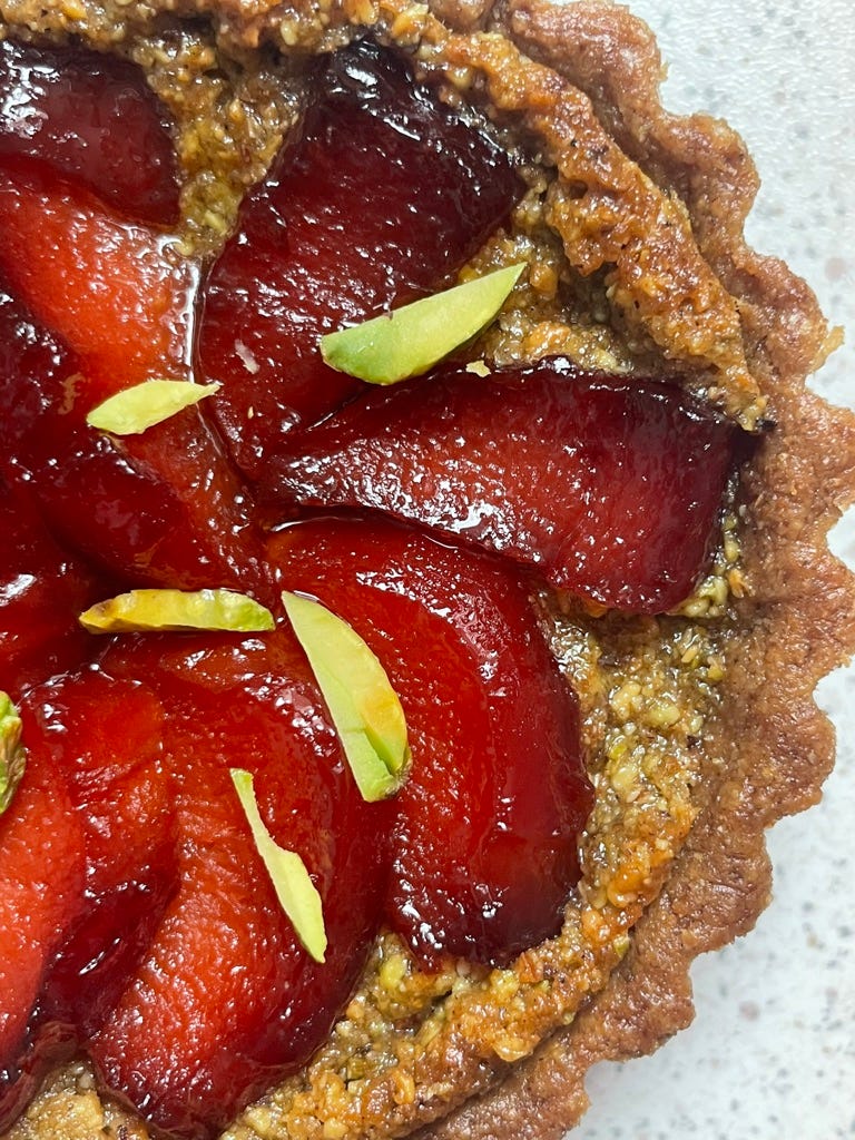 beat together the rest of the infused butter (30g), caster sugar (30g), pistachios (30g), flour (5g) to form a thick spread