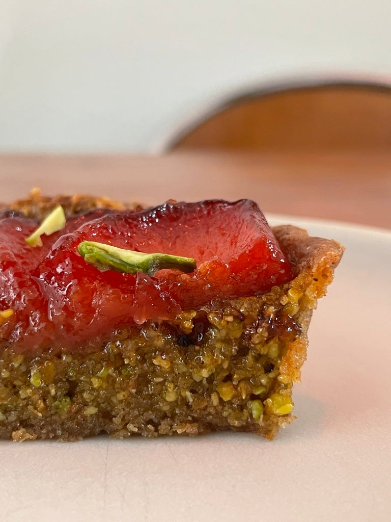 this is my take on persian love cake - pistachios, rosewater, cardamom, cinnamon, nutmeg and slow-poached quinces