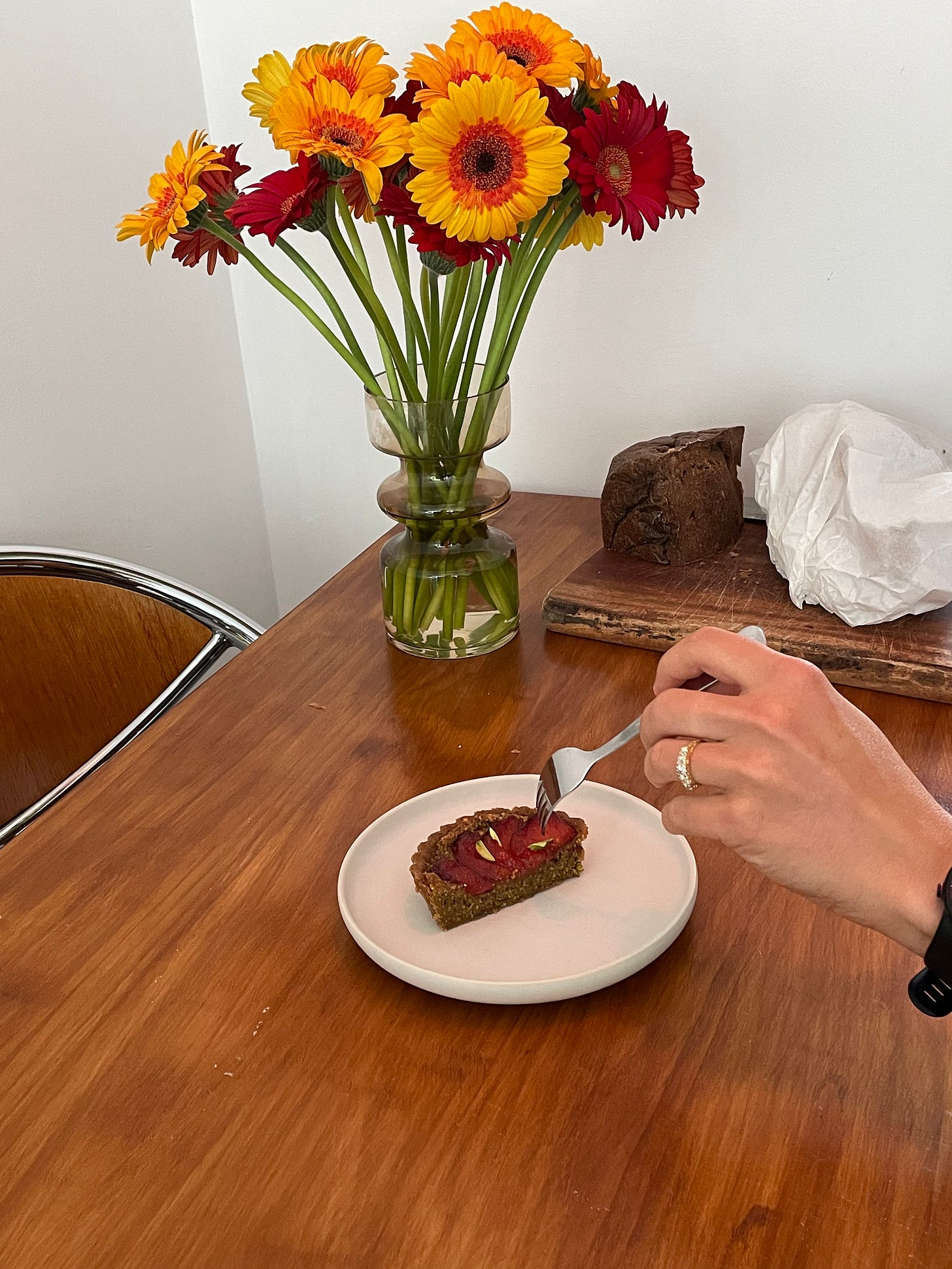 lay the tart dough into a small (10cm) tart tin, making sure to press into the corners and trim the edges