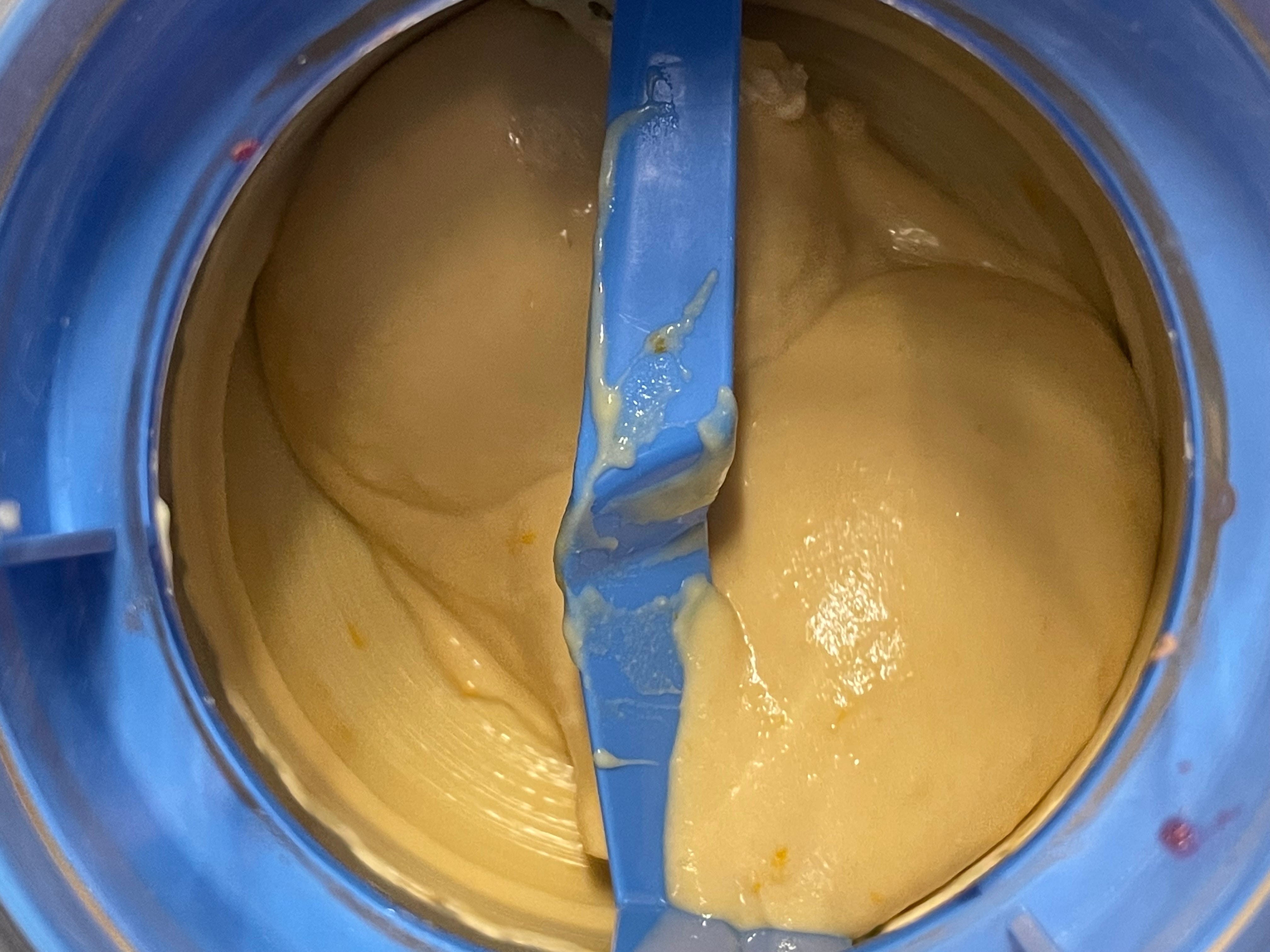 once totally chilled, add to ice cream maker with the marmalade (1 tbsp) and churn for 15-20 minutes until soft-serve consistency
