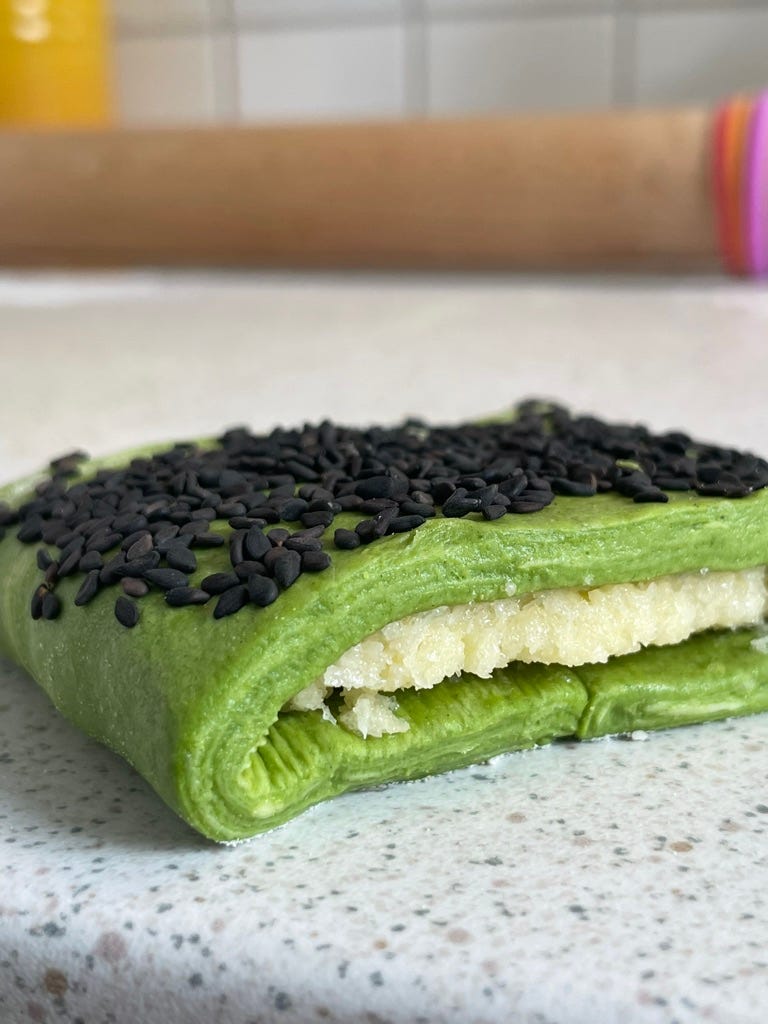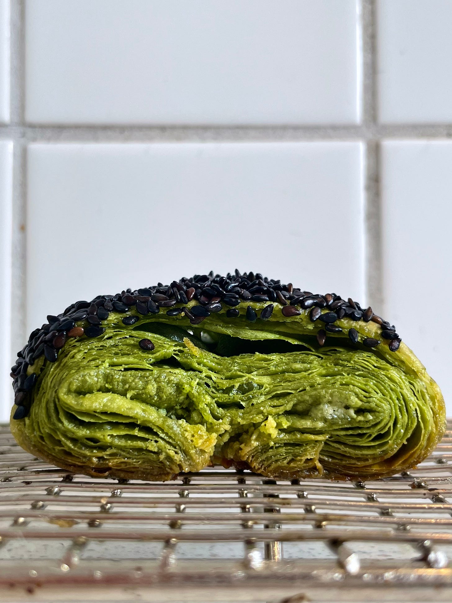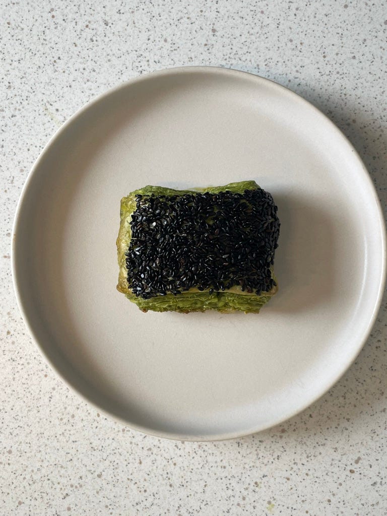 matcha puff pastry, coconut frangipane filling & topped with black sesame seeds