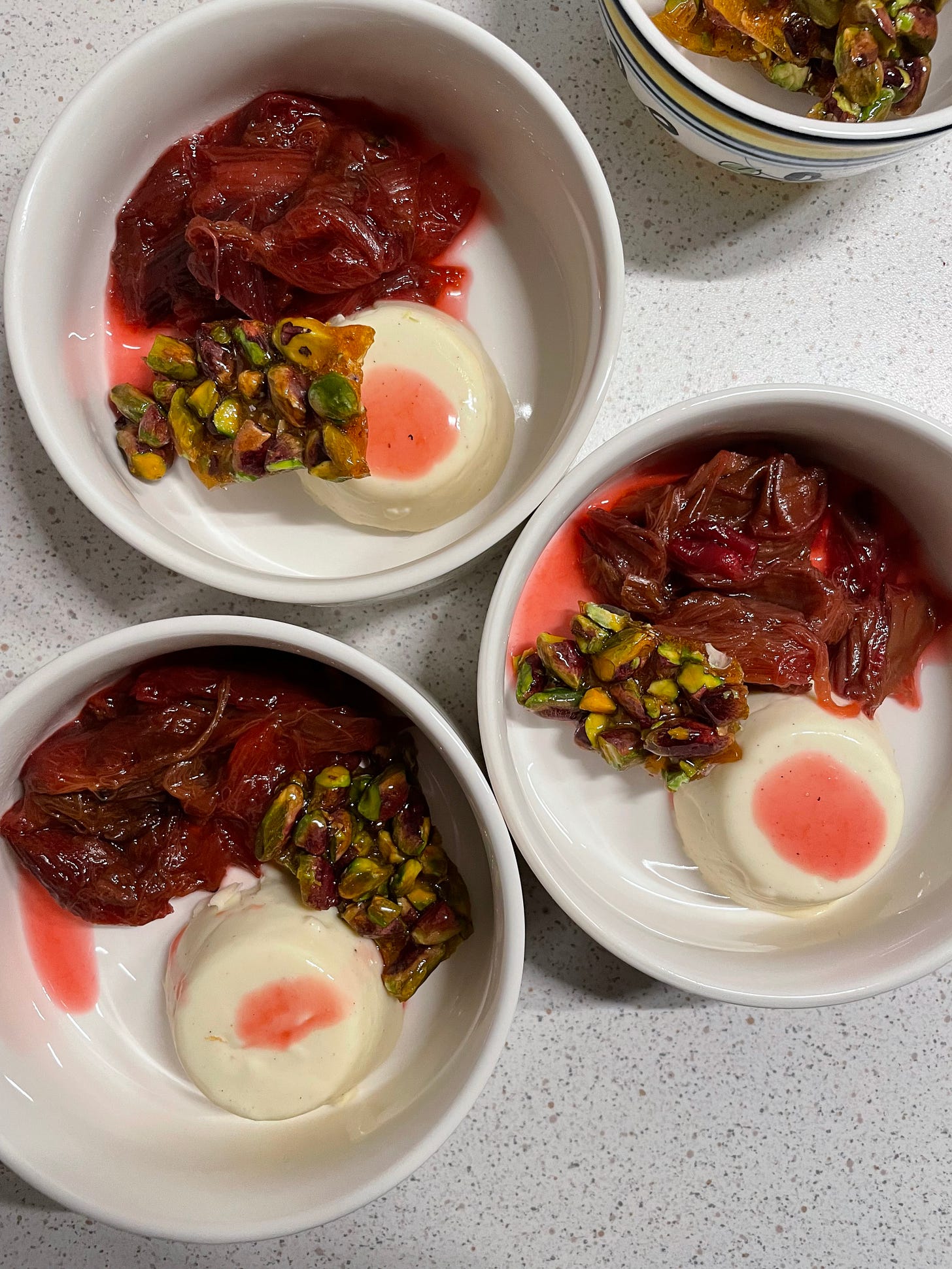 espresso & hazelnut: add 1 teaspoon instant coffee to the gelatine milk mixture while making the panna cotta, nix the rhubarb, and replace the pistachios with hazelnuts in the brittle