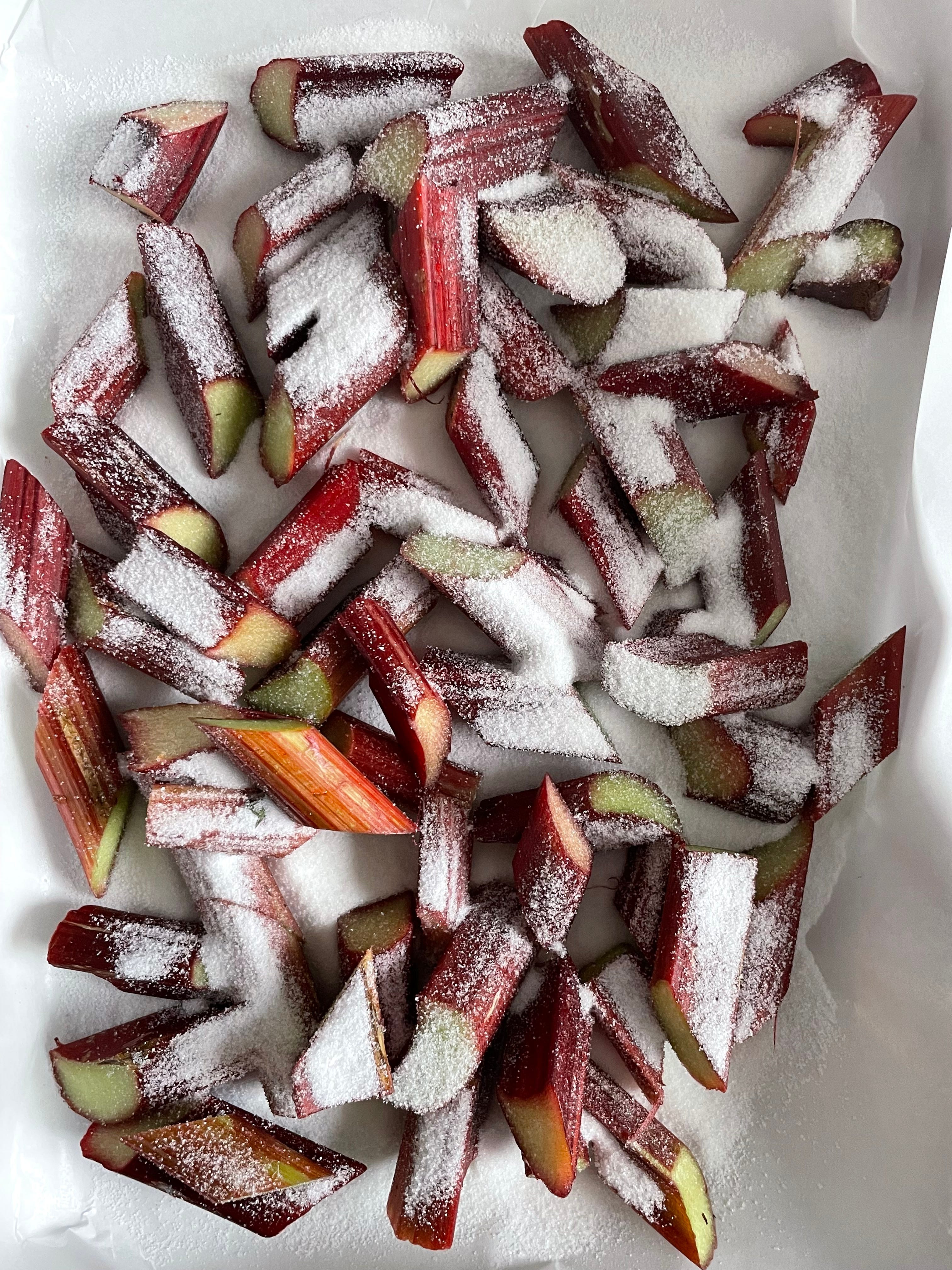 toss together the rhubarb (1 bunch) and caster sugar (15% of the rhubarb by weight) in a bowl and leave to sit for 15 minutes