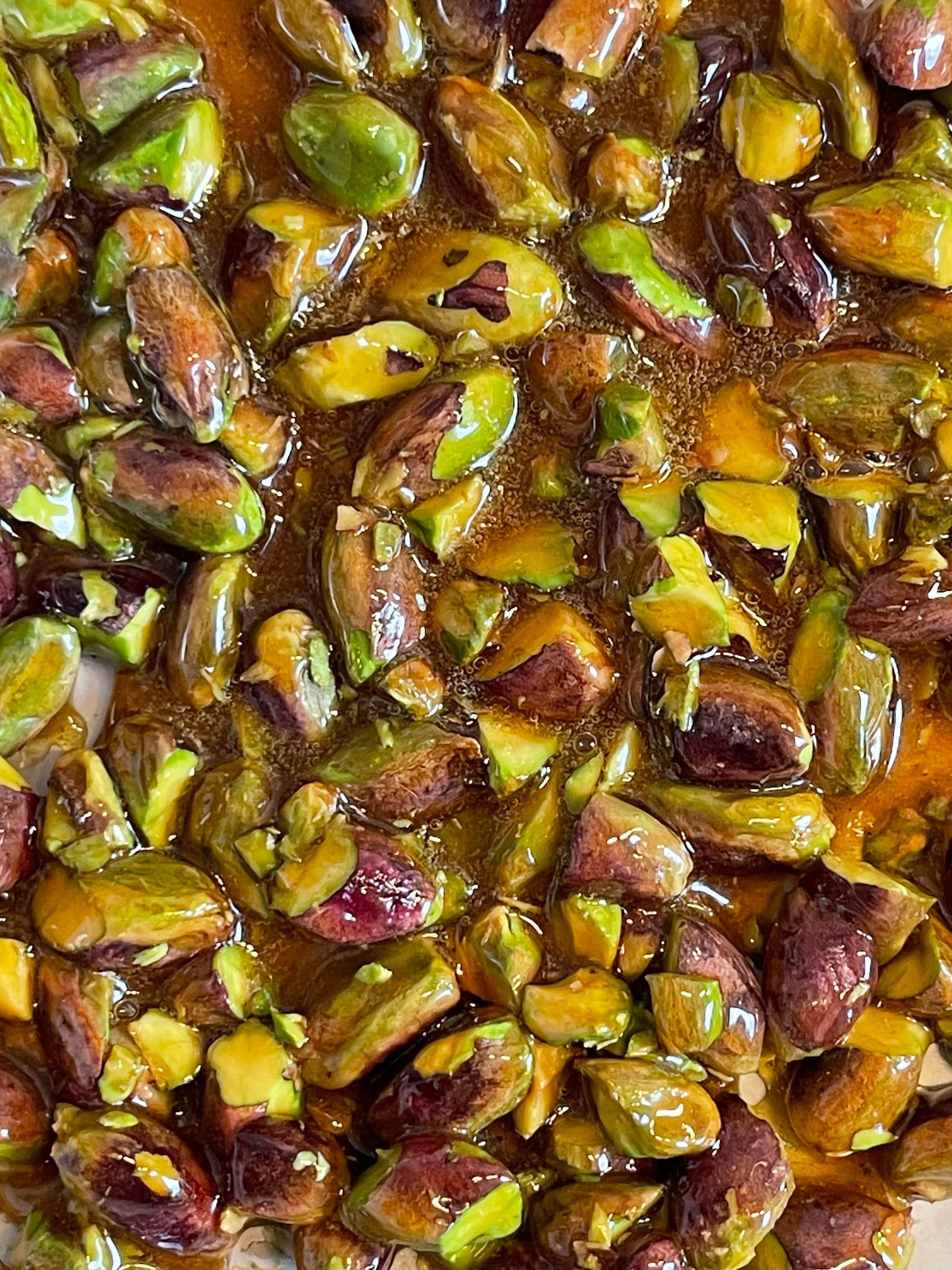 pour the sugar syrup over the chopped pistachios and sprinkle with salt
