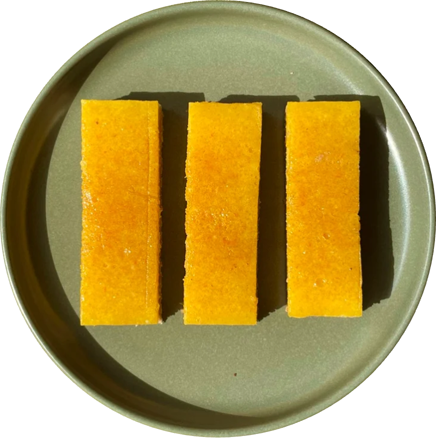as soon as the shortbread base has been pulled from the oven, strain the filling mixture and discard the grated turmeric shreds