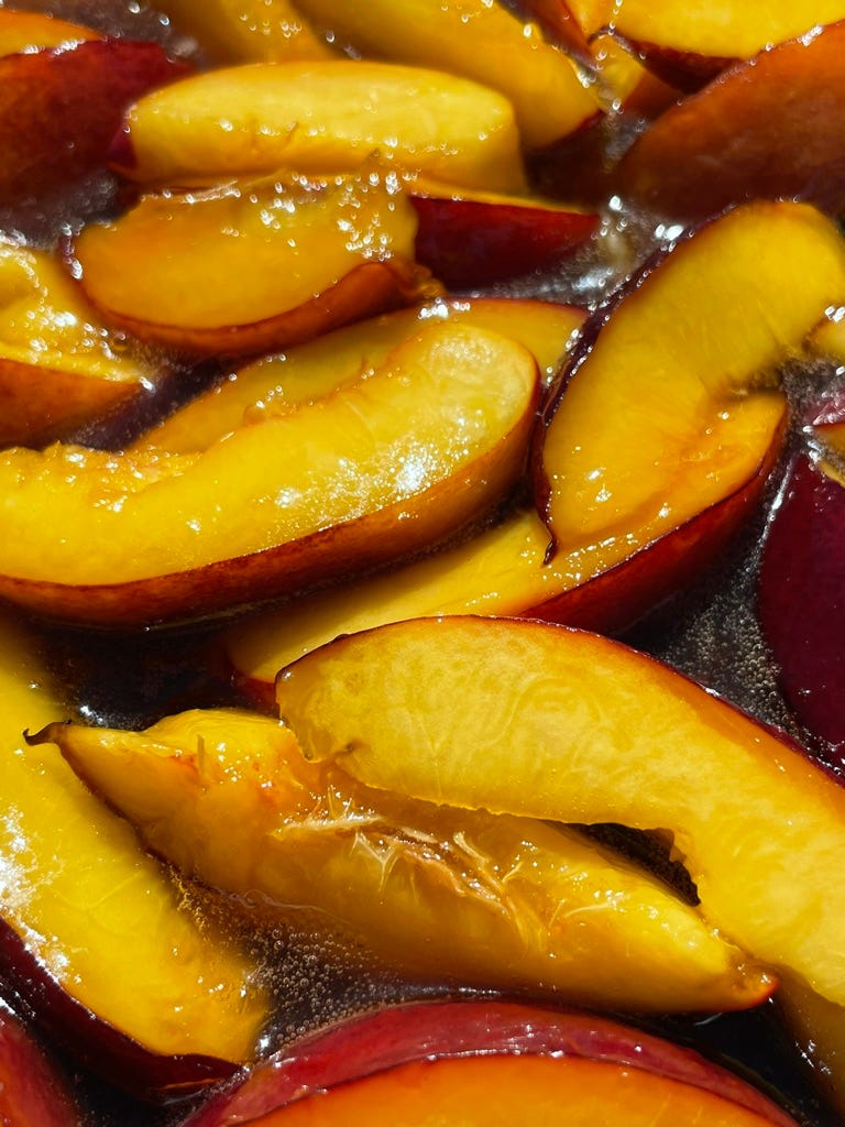 arrange the peach slices (beware: hot!) in the base of the pie tin, fitting as many of the peach slices as you can