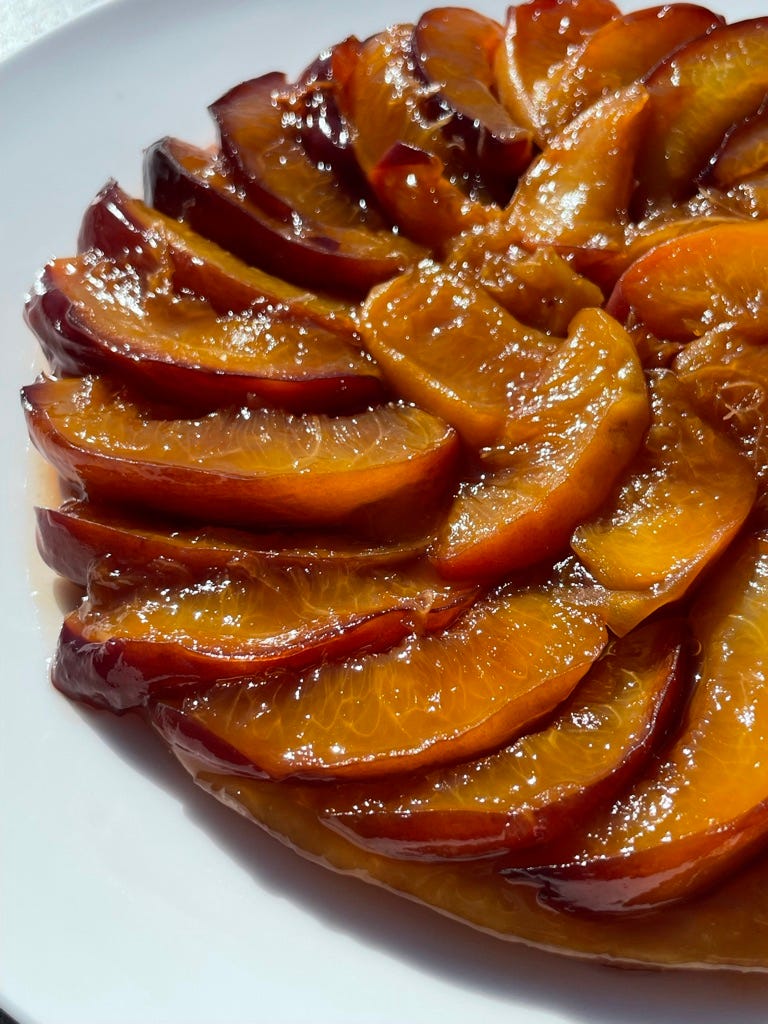 let the tart cool for 10 minutes (but no longer! otherwise the caramel may harden and stick the peaches to the tin when you go to turn it out. if this happens, either briefly return the pie tin to the oven to loosed the caramel, or dip it in a boiling water bath)