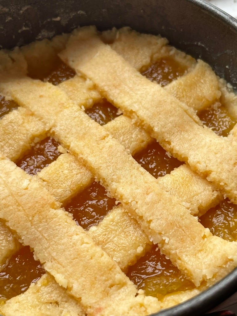 cut 1cm strips of pastry and arrange in a lattice pattern on top of the tart