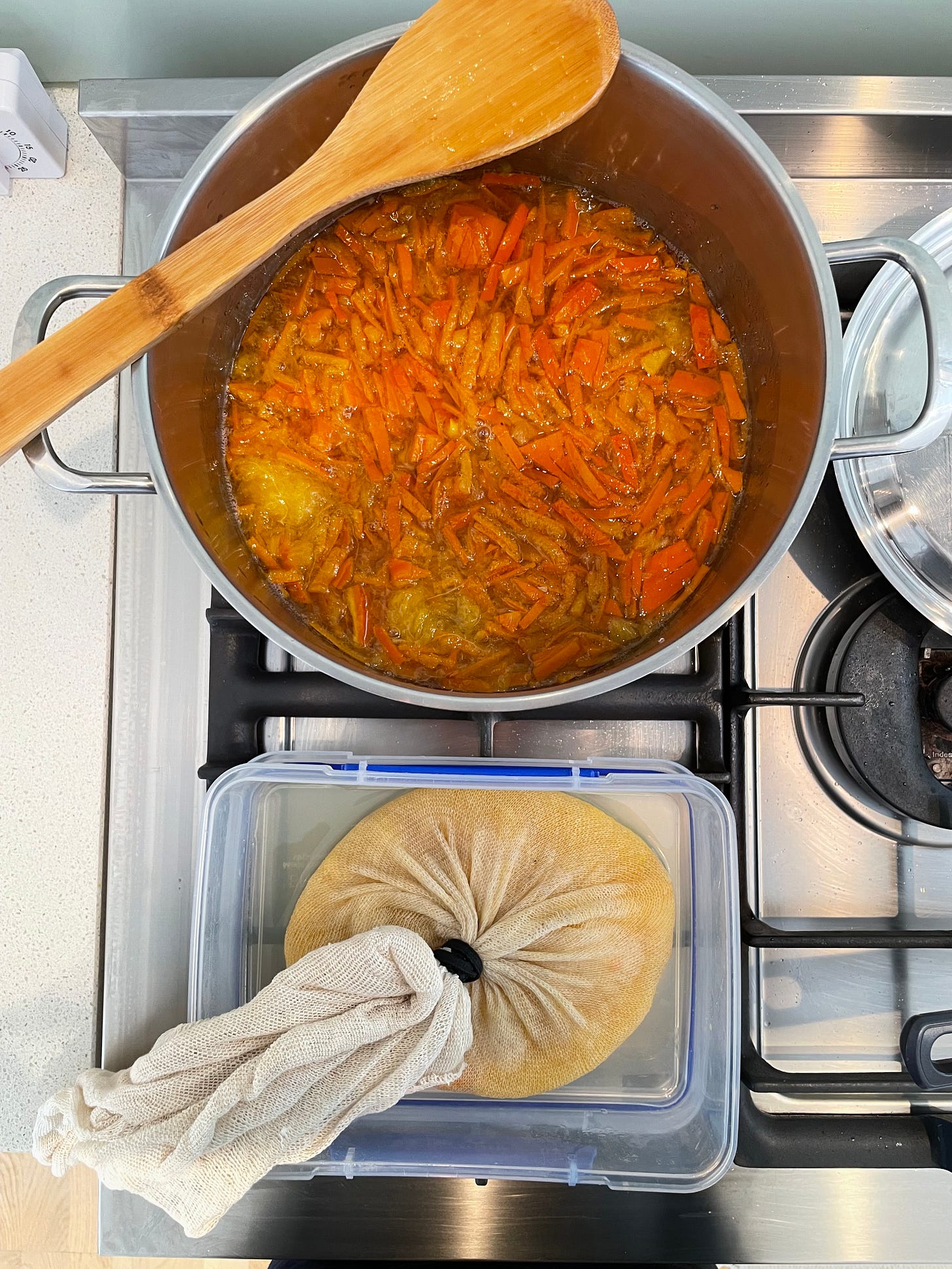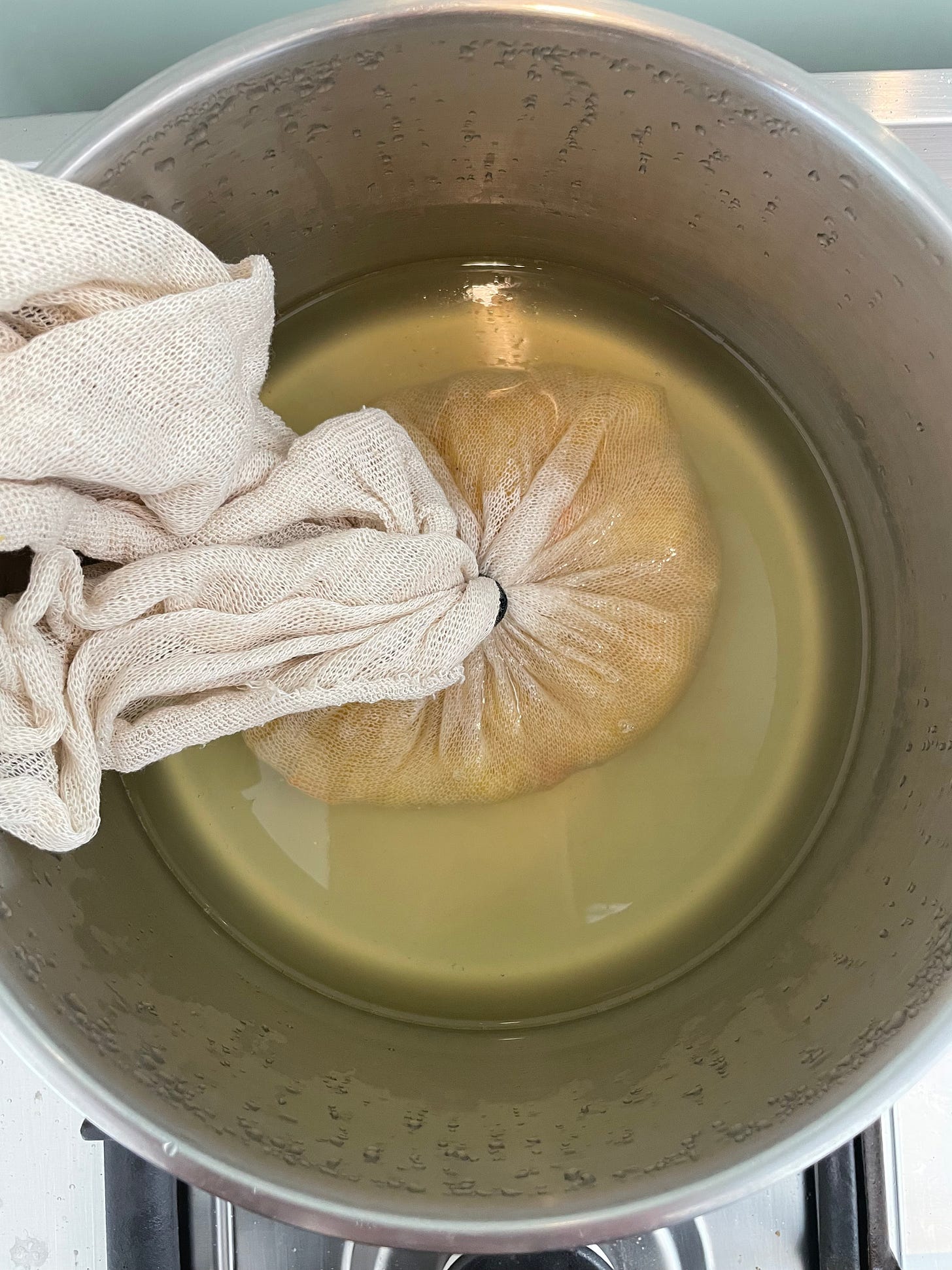 returning to the cheesecloth bag, squeeze and twist gently to extract the pectin from the piths. the liquid should feel thickened and smooth