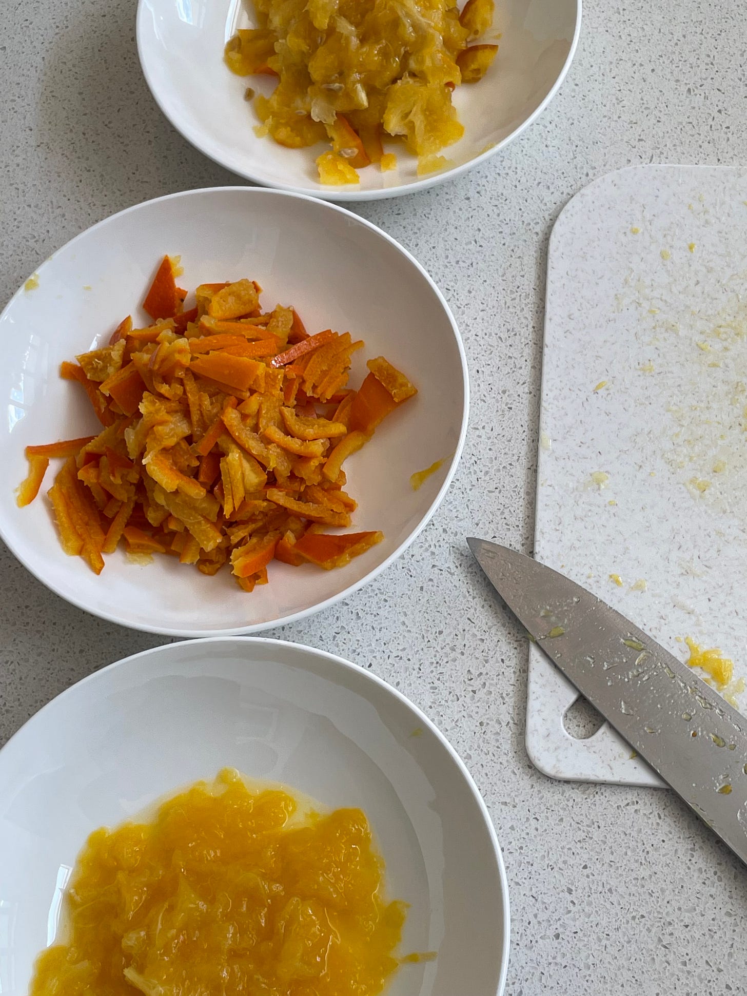 once the oranges are cooled, set out three bowls