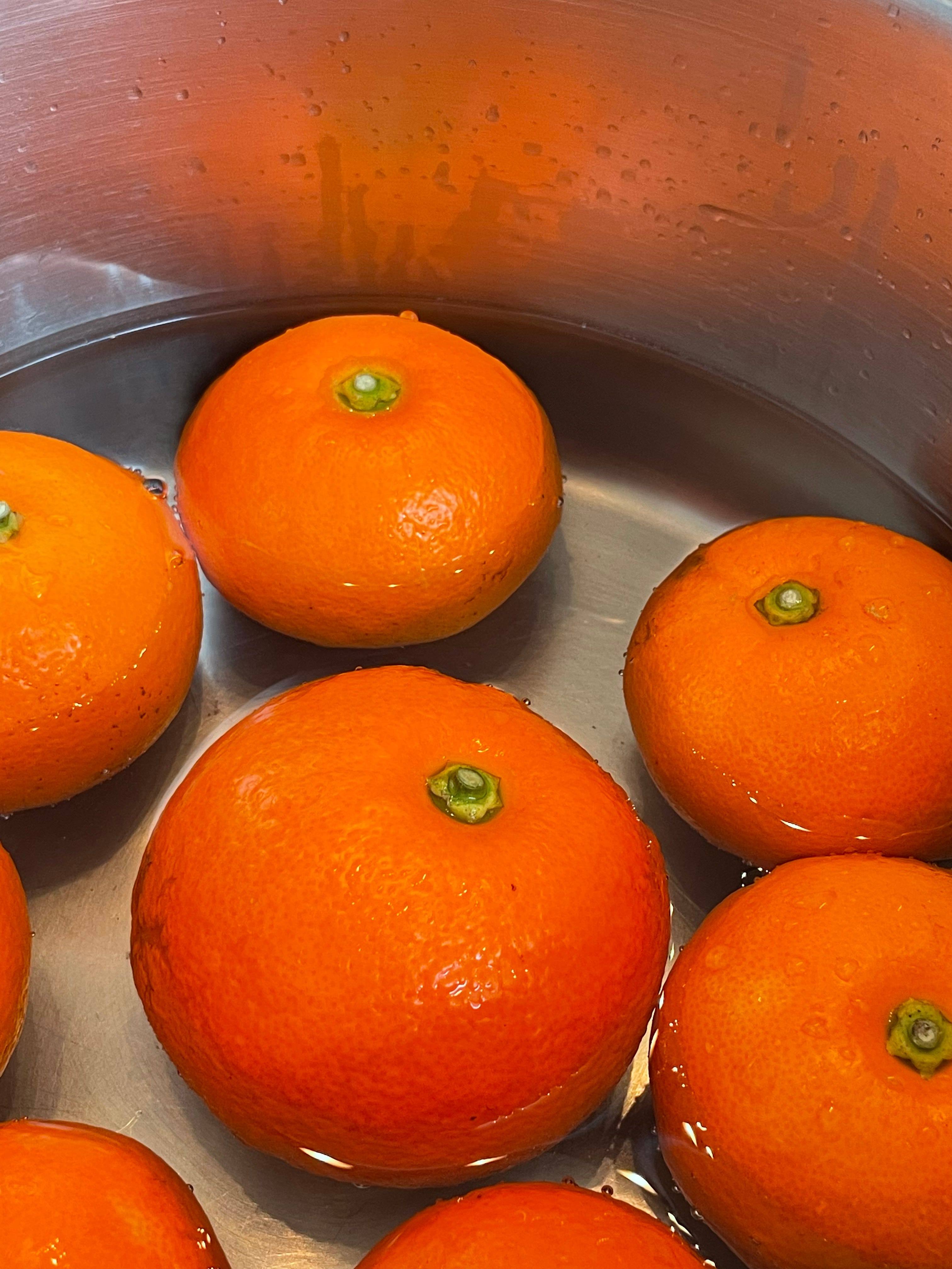 bring to a simmer and cook, covered, for about 45 minutes until the skin of the oranges is easily pierced with a knife. flip them over a few times to make sure all the peel gets cooked