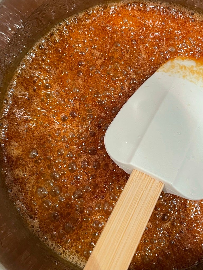 as soon as the sugar is perfectly golden brown but not burnt, add the butter (22g) and stir vigorously