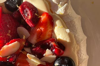 topped with fresh new zealand cherries, blueberries, strawberries, pomegranate & flaked almonds